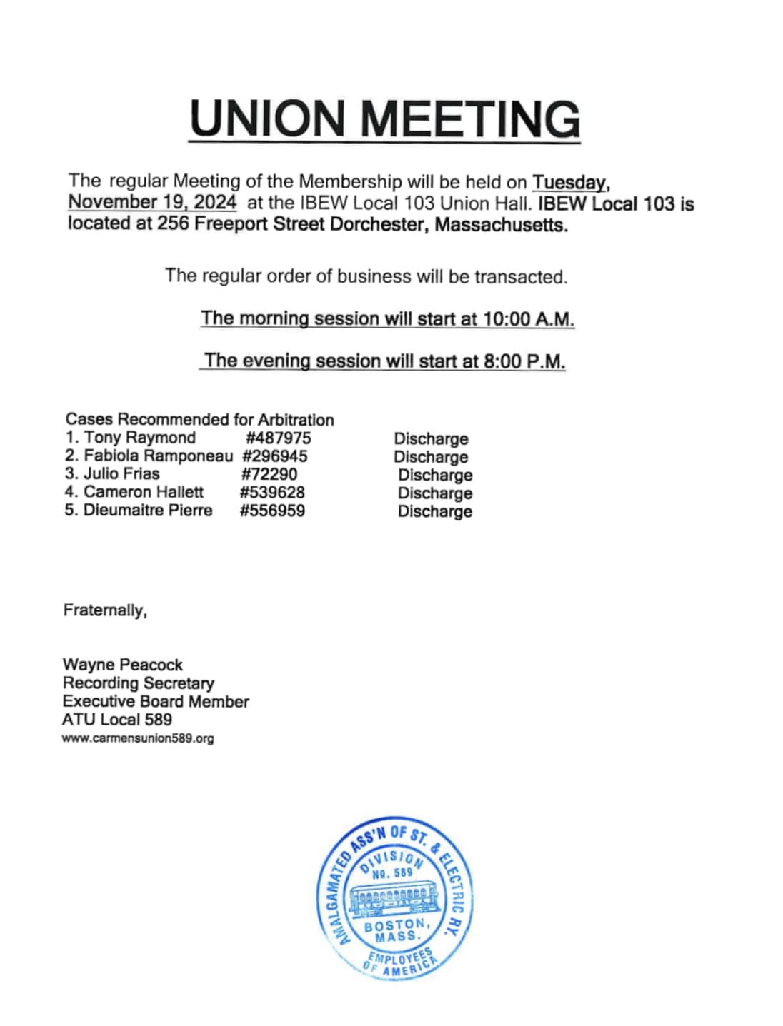 Dear Local 589 Members, Join us for an evening of celebration, camaraderie, and holiday cheer! Boston Carmen’s Union Local 589 Holiday Party Date: Saturday, December 21, 2024 ⏰ Time: 7:00 PM – 12:00 AM Location: IBEW L103, 256 Freeport Street, Dorchester, MA Tickets are $40 each, with a limit of 2 tickets per member. Only…