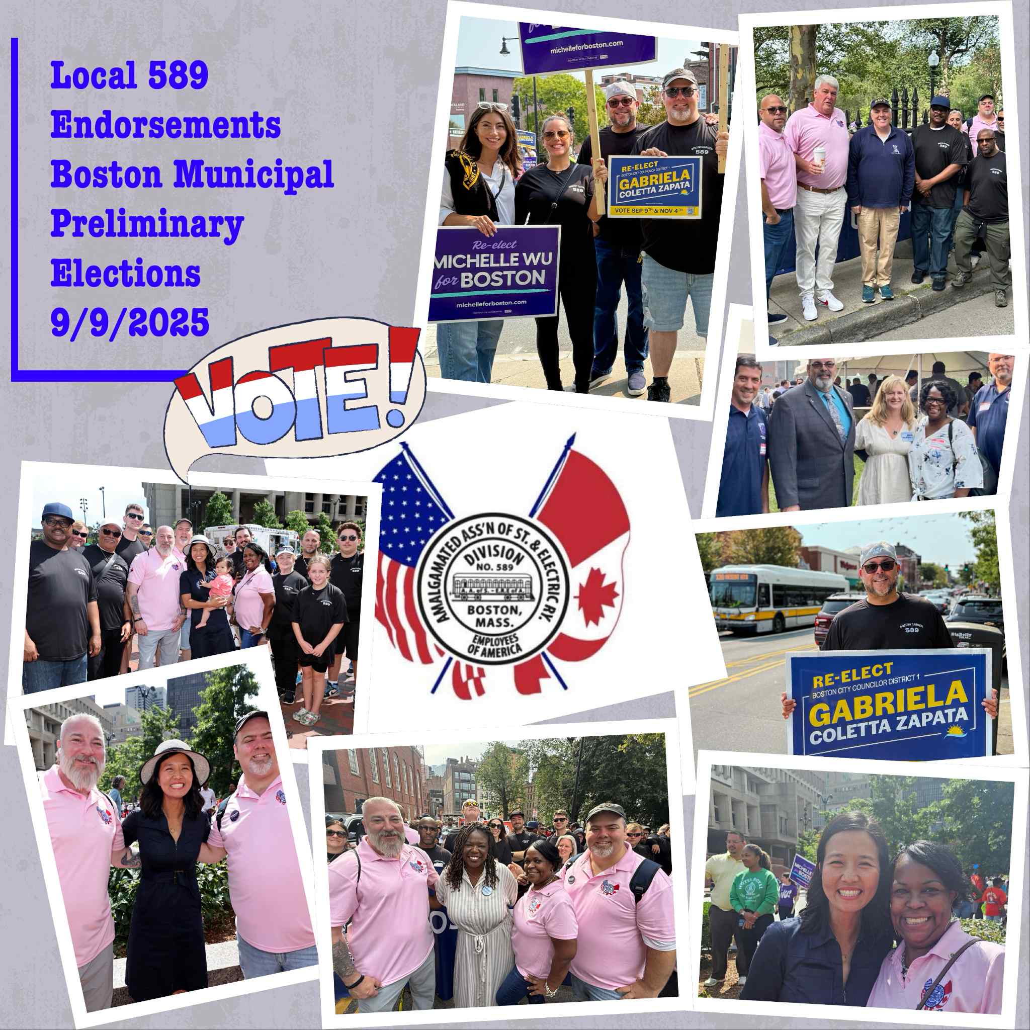 Dear Local 589 Members, The Executive Board of Boston Carmen’s Union, Local 589 urges all members and retirees who live in Boston to support our endorsed candidates: Mayor: Michelle Wu At-Large City Council: Ruthzee Louijeune, Erin Murphy, Frank Baker District 1: Gabriela Coletta Zapata District 2: Ed Flynn Find your polling place: Click here to…