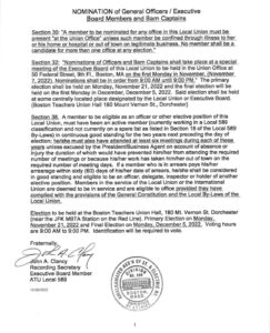 Section 30: “A member to be nominated for any office in this Local Union must be present “at the Union Office” unless such member be confined through illness to her or his home or hospital or out of town on legitimate business. No member shall be a candidate for more than one office at any election.”…