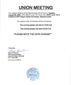 Don’t miss our next union meeting on Tuesday, August 26, at two convenient times: 10 a.m. and 8 p.m. at IBEW Local 103 in Dorchester.