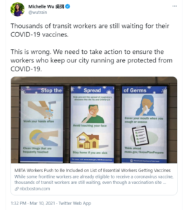 Today, Boston City Councilor Michelle Wu tweeted (see below) it is wrong that our members are still waiting for the vaccine. We could not agree more. Thank you Councilor Wu for standing up for our members who, as essential transit workers, would desperately like to get the vaccine they were promised so they can protect…