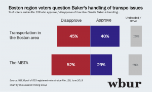 WBUR | By Zeninjor Enwemeka | June 27, 2019 Boston-area voters are really frustrated with transportation — and they don’t like how the MBTA has been handled by state leaders, according to a new WBUR poll (topline results, crosstabs). Compared with five years ago, just 4% of survey respondents say it’s gotten easier to get around the region.…