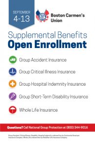 Boston Carmen’s Union members will have the opportunity to participate in the union-sponsored supplemental benefits program September 4 – 13, 2019. Local 589 members will have access to the following supplemental benefits: Accident Insurance – pays for injuries & treatments resulting from an accidentCritical Illness Insurance – pays a lump sum benefit if you suffer from a critical illness…