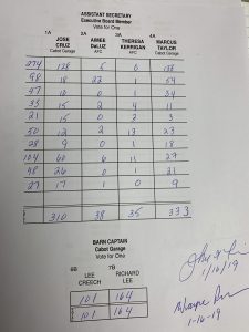 Attached are the results from tonight’s special primary election. The two candidates (Cruz and Taylor) who received the most votes in the race for assistant secretary will face off in the final election on Wednesday, January 30th, 2019. Make sure to come out and vote. Richard Lee is the new barn captain for Cabot. Congrats…